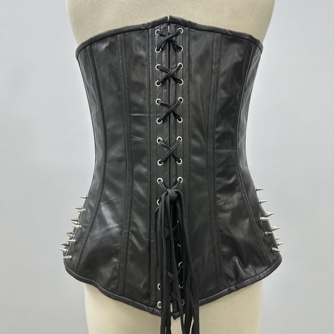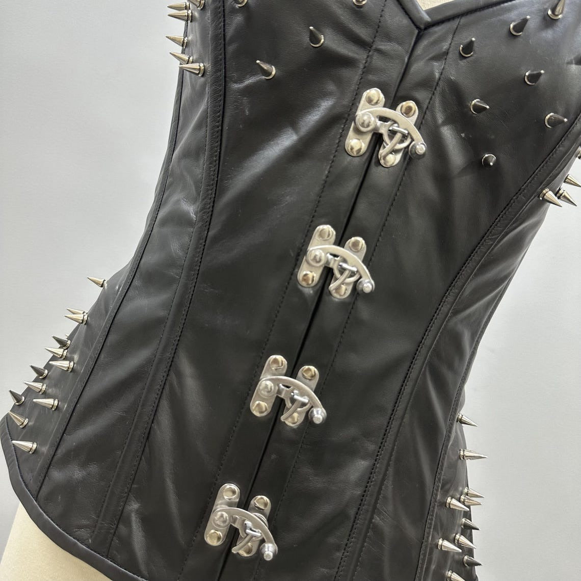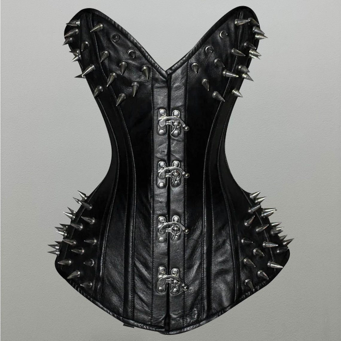 Command attention with the women black leather overbust corset from Glory Store UK, designed for gothic, steampunk, and fashion-forward styles. Crafted from 100% premium leather with a cotton twill lining, this corset combines comfort with edgy sophistication. Strong steel boning provides structured waist shaping, while metal spikes across the bust and sides deliver a rebellious, bold finish. Fully lined and featuring lace-up back closure with clasp accents, it ensures a secure, customizable fit. Available in all sizes (3XS–9XL) and customizable colors, this corset is perfect for statement-making looks, events, or alternative fashion enthusiasts seeking style and durability.