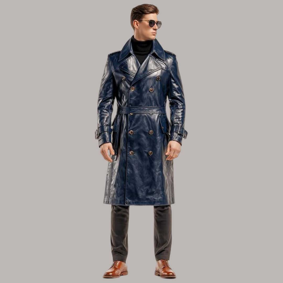 Elevate your style with this men navy blue leather trench coat crafted from 100 percent genuine cowhide. The rich navy shade gives a bold, modern edge while the double breasted front with classic button closure adds timeless sophistication. Designed with an adjustable belted waist and cuff straps, it ensures a tailored fit that enhances both comfort and structure. Its long trench silhouette makes it a versatile choice, perfect for formal occasions, smart streetwear, or standout everyday layering. A premium coat built for men who value quality, detail, and distinctive fashion.