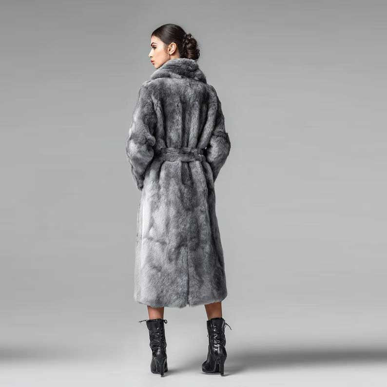 Wrap yourself in warmth and sophistication with this silver grey genuine mink fur coat. Crafted from 100% real mink, it offers a luxuriously soft touch and a natural sheen that catches the light beautifully. The full-length silhouette with a belted waist creates a flattering fit while keeping you warm during cold winter nights. Designed for elegance and comfort, this overcoat moves gracefully with every step, making it perfect for formal events, winter galas, or adding a touch of refined luxury to your everyday style. A true statement of craftsmanship and timeless fashion.