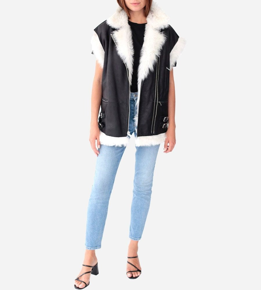 Elevate your wardrobe with this women white fur leather biker vest in black, crafted from genuine sheepskin leather for a bold yet refined look. The soft faux shearling lining offers cozy warmth, while the sleek zipper closure ensures a secure fit. Designed with four side pockets for practicality, this vest blends biker edge with modern luxury. Its versatile black color makes it easy to pair with both casual and elevated outfits, perfect for those who value comfort and style.
