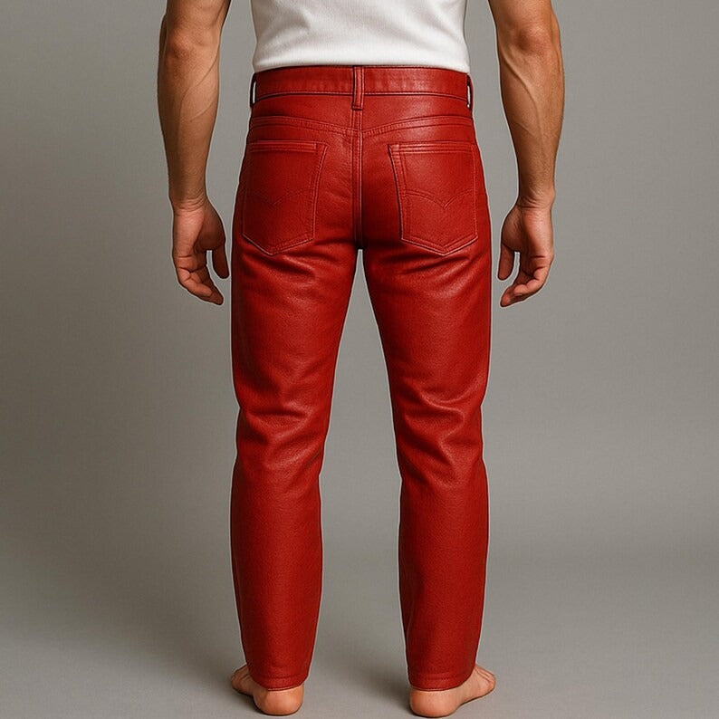 Make a confident statement with these Mens Red Leather Five Pocket Pants, handcrafted from 100% genuine sheepskin leather. Built with double stitching for lasting strength, they feature a classic five-pocket design for practicality, zipper front closure, and perfect belt loops for a clean fit. Fully satin-lined for comfort, these pants combine premium craftsmanship with bold, standout style. Ideal for parties, casual wear, or fashion-forward outfits, they bring timeless design and modern edge together.