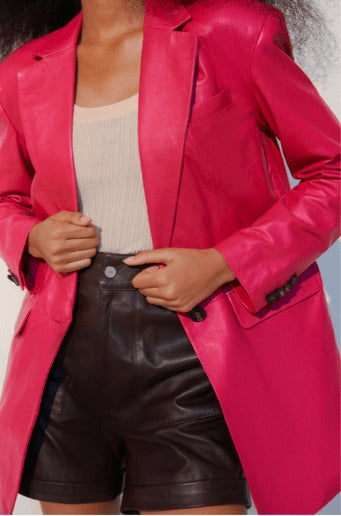 Brighten your style with the women single breasted pink leather blazer from Glory Store UK. Crafted in premium sheepskin leather, this blazer delivers a polished silhouette with a touch of playful elegance. The soft viscose lining keeps it comfortable, while the single breasted closure enhances its refined shape. Designed with two handy side pockets and one inner pocket, it balances style with function. The tailored fit and striking pink shade make it a standout piece, perfect for pairing with formal outfits or elevating casual looks. A modern essential for confident women who value quality, fashion, and versatility.