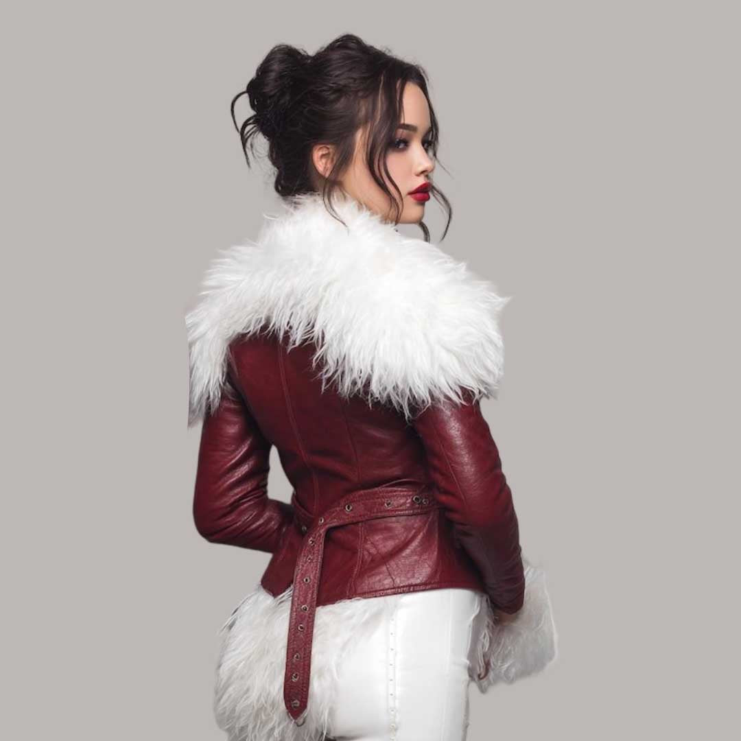 Stand out in style with this burgundy shearling leather aviator jacket, crafted from premium genuine leather and lined with soft white shearling for warmth and comfort. The rich burgundy tone makes a bold fashion statement, while the plush fur collar and cuffs add elegance and luxury. Designed with an adjustable belted waist for a flattering fit, this jacket is perfect for winter outings, parties, or making a statement in everyday fashion. A timeless piece that combines durability, comfort, and standout style for men and women who value quality.