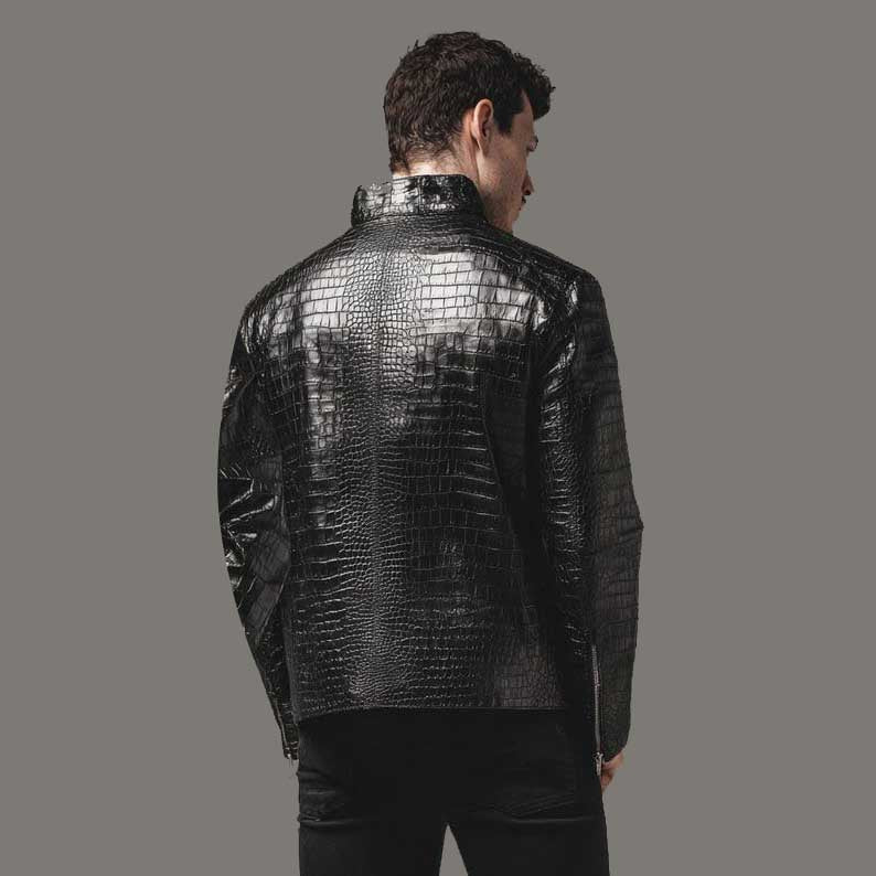 Make a powerful impression with this genuine black crocodile leather jacket, crafted from 100% authentic exotic skin. Its glossy black finish delivers a bold luxury statement, while premium handmade craftsmanship ensures durability and refined detail. Designed in a modern slim fit, this jacket moves seamlessly between casual and formal settings, offering versatility with undeniable sophistication. A rare and collectible piece, it represents timeless fashion and investment-worthy quality, perfect for men who value exclusivity and exotic elegance.