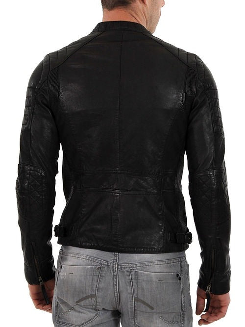 Take your style up a notch with the Men Black Biker Leather Jacket. Made from soft lambskin, it delivers a smooth feel with a strong biker look. The mandarin collar, zip closure, and quilted shoulder details add a bold touch, while multiple pockets keep essentials secure. Fully lined for comfort and finished with zippered cuffs, this jacket gives you a clean, modern profile built for daily wear and night outings. A sharp layer that lasts.