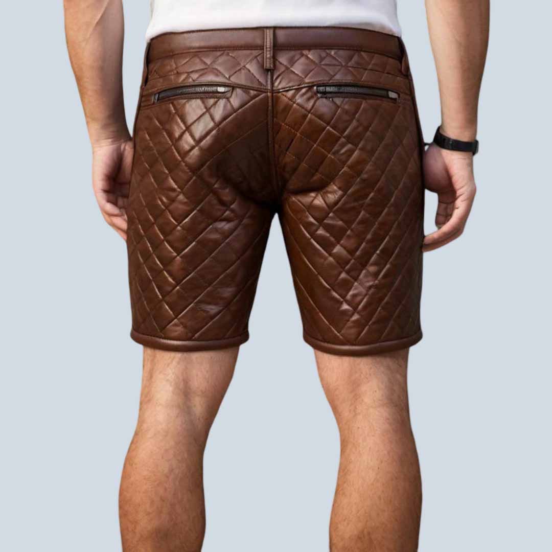 Men Brown Quilted Sheep Leather Shorts with Diamond Stitch Design