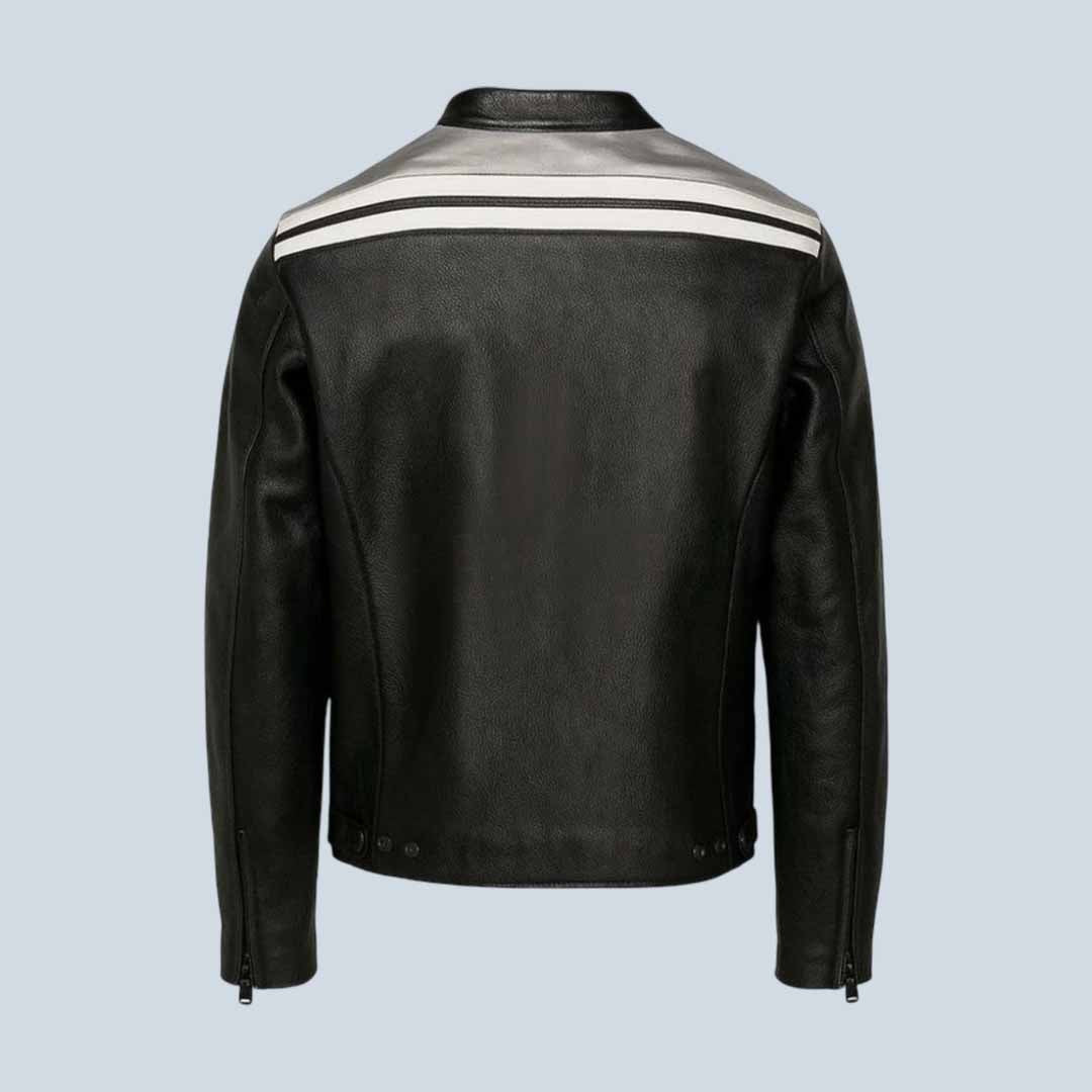 Ride in style with this men’s black leather motorcycle jacket, crafted from 100% premium cowhide leather for durability and a sleek, timeless look. Inspired by vintage cafe racer design, it features bold white racing stripes that add a sporty, fashion-forward edge. The soft polyester lining ensures comfort for all-day wear, while the streamlined silhouette complements casual and biker outfits alike. Perfect for men who love motorcycles, streetwear, or vintage-inspired fashion, this jacket pairs effortlessly with jeans, boots, or leather pants for an iconic, confident look.