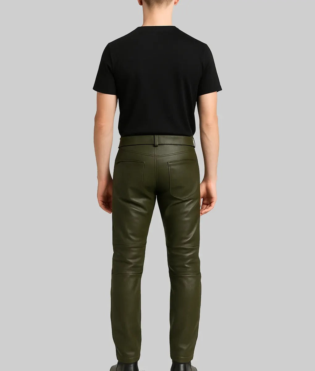 Mens Green Regular Style Leather Pants