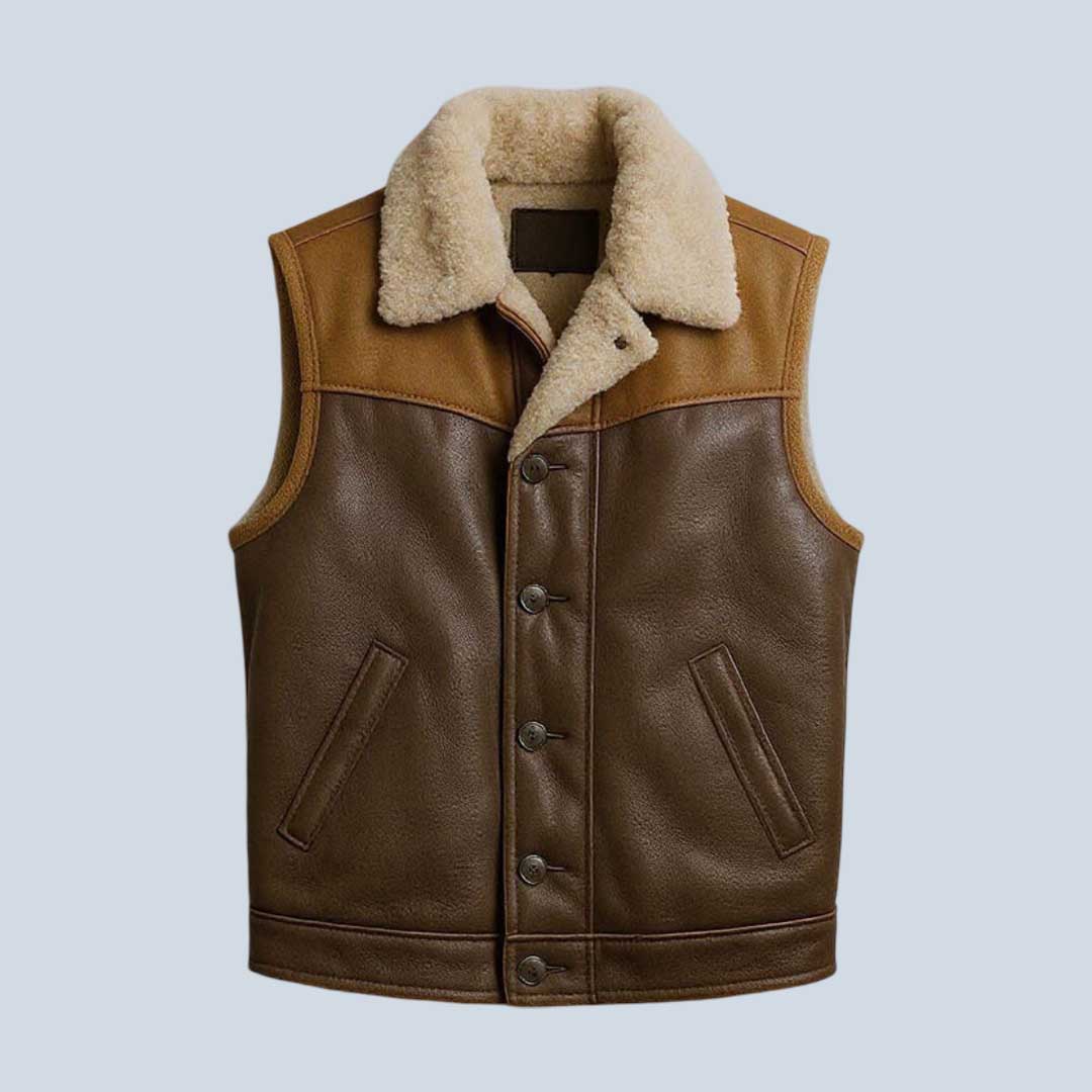 Classic Brown Sheepskin Western Vest with Faux Fur for Men