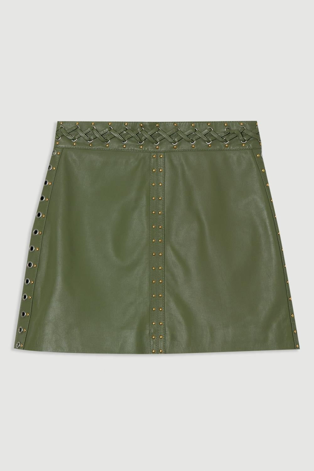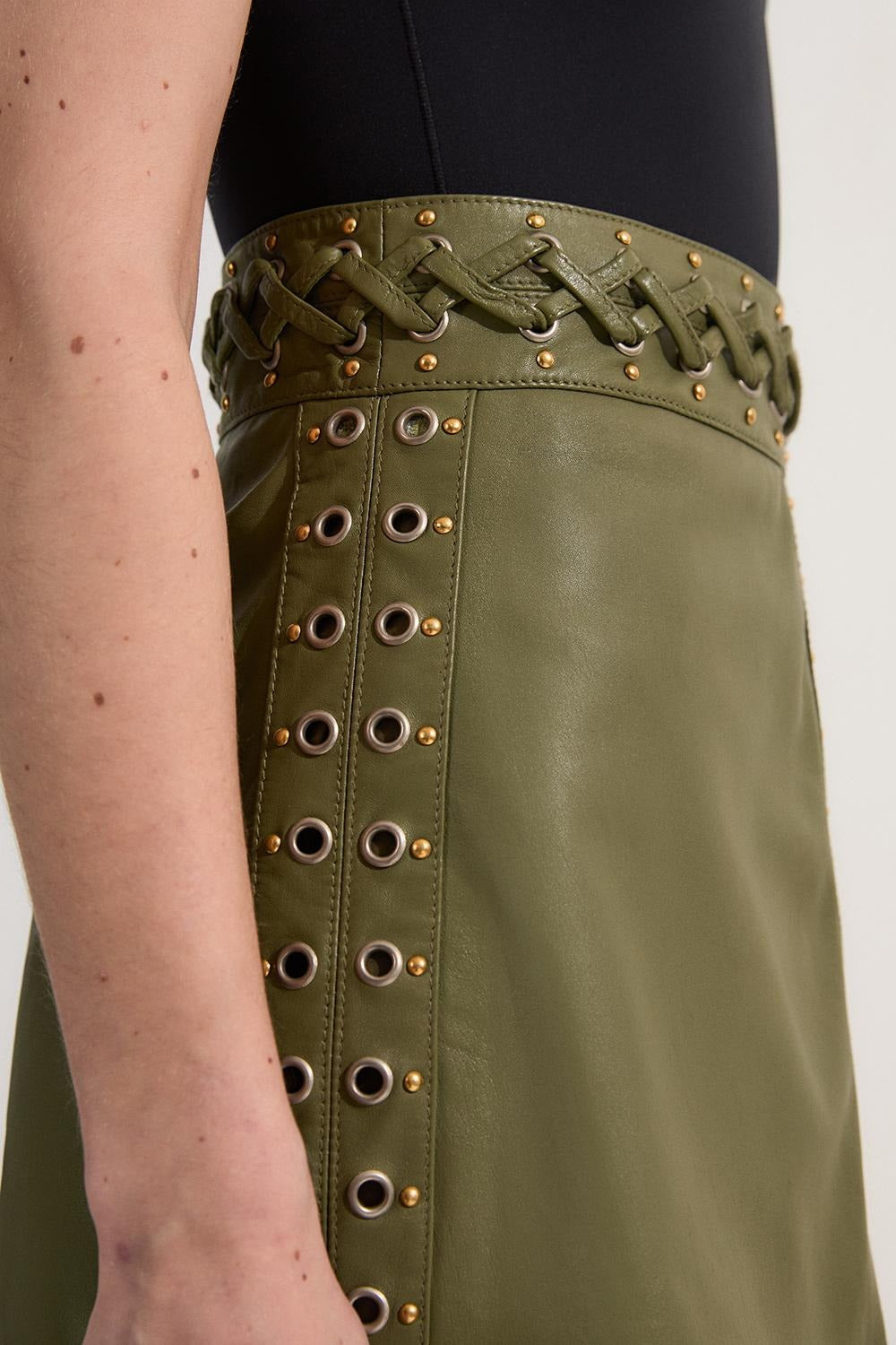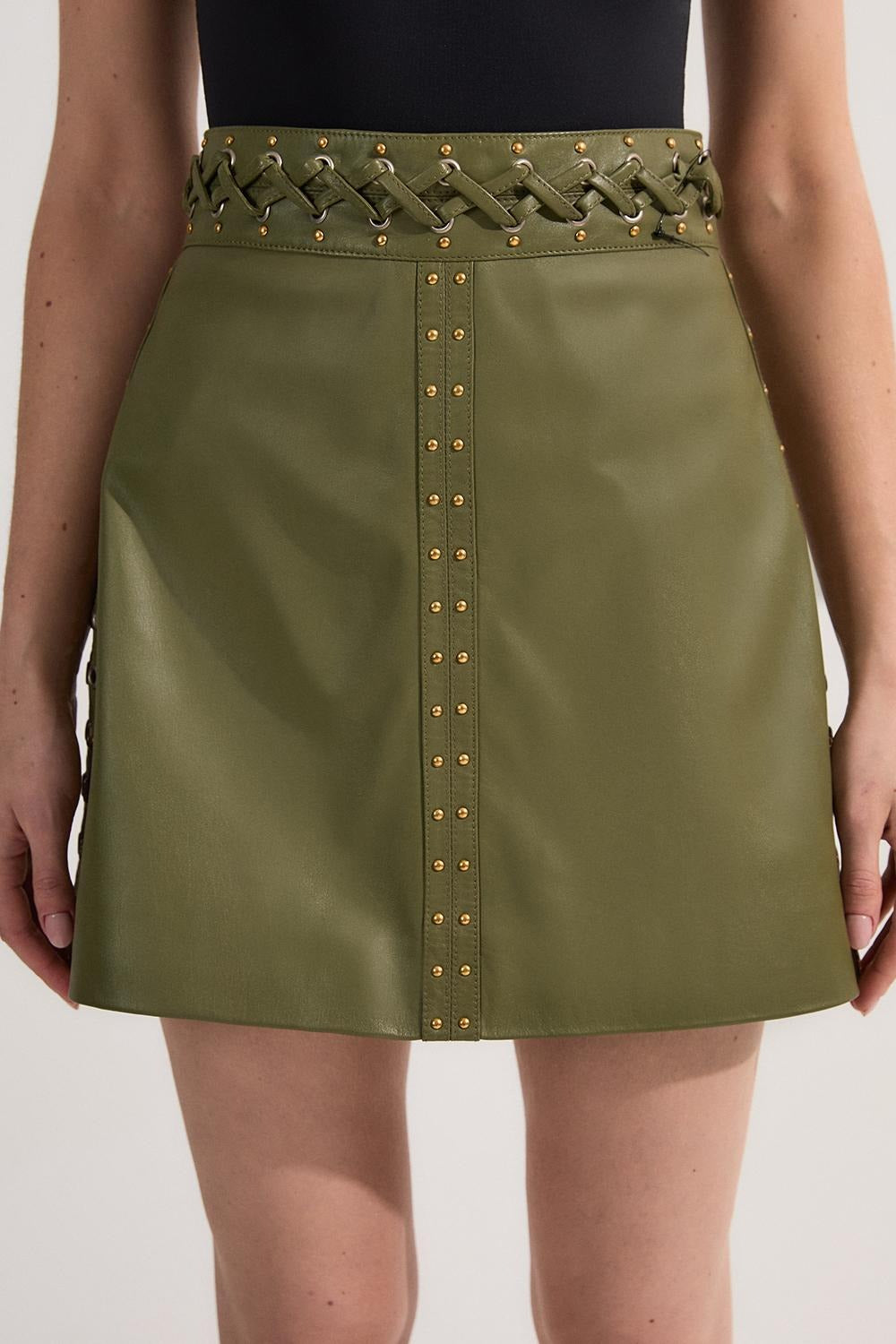 Elegant Women Light Green Leather Eyelet Lace Trim Mini Skirt