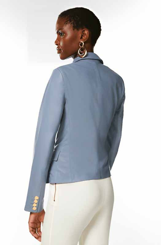 Step into effortless sophistication with the women stone blue leather blazer with golden button from Glory Store UK. Made from premium real leather, this blazer combines timeless tailoring with a modern twist in a rare stone blue shade. The sleek silhouette is enhanced by a single golden button closure, creating a polished look perfect for both casual and formal occasions. Soft viscose lining ensures all-day comfort, while two side pockets and one inner pocket add practicality to its chic style. Designed for fashion-conscious women in the USA, UK, and Canada, this blazer offers the perfect mix of luxury, durability, and comfort.
