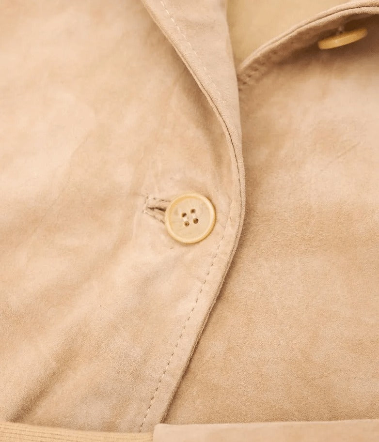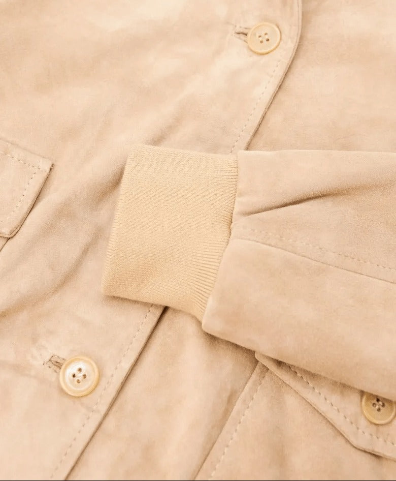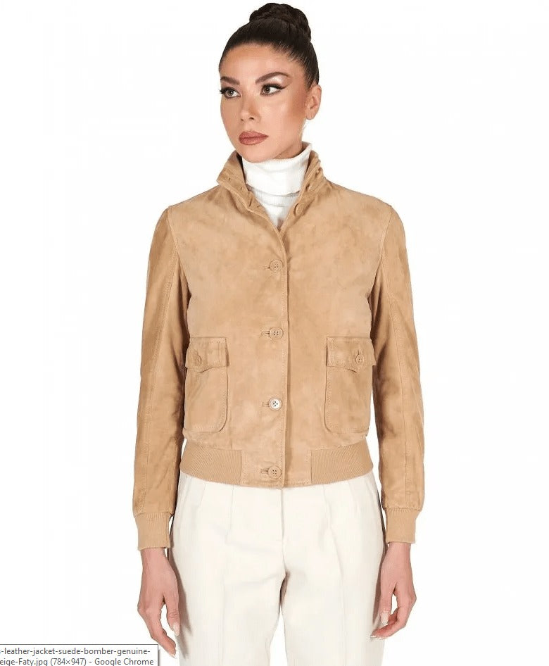 Elevate your style with this women tan brown suede leather trucker jacket, crafted from genuine goatskin for lasting quality and comfort. The rich tan brown color adds a versatile charm that pairs easily with casual or dressy looks. Designed with a soft viscose lining, button front closure, and two functional side pockets, it blends classic appeal with everyday practicality. Perfect for modern women who value style, comfort, and premium craftsmanship.