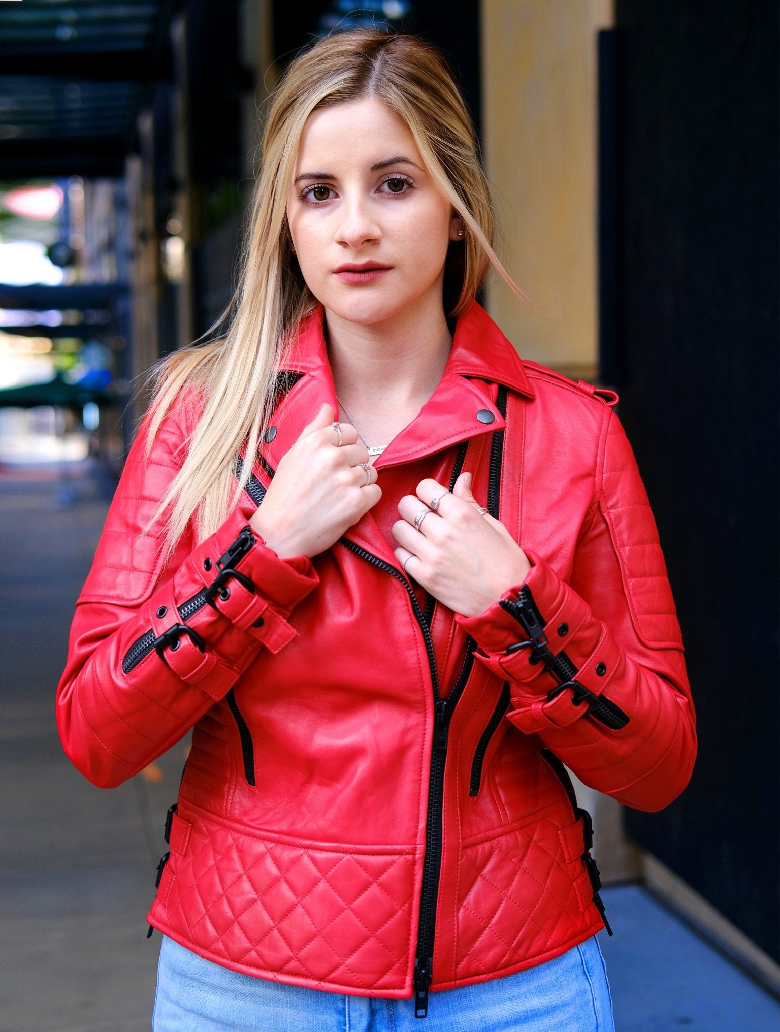 Women's Quilted Red Biker Motorcycle Leather Jacket